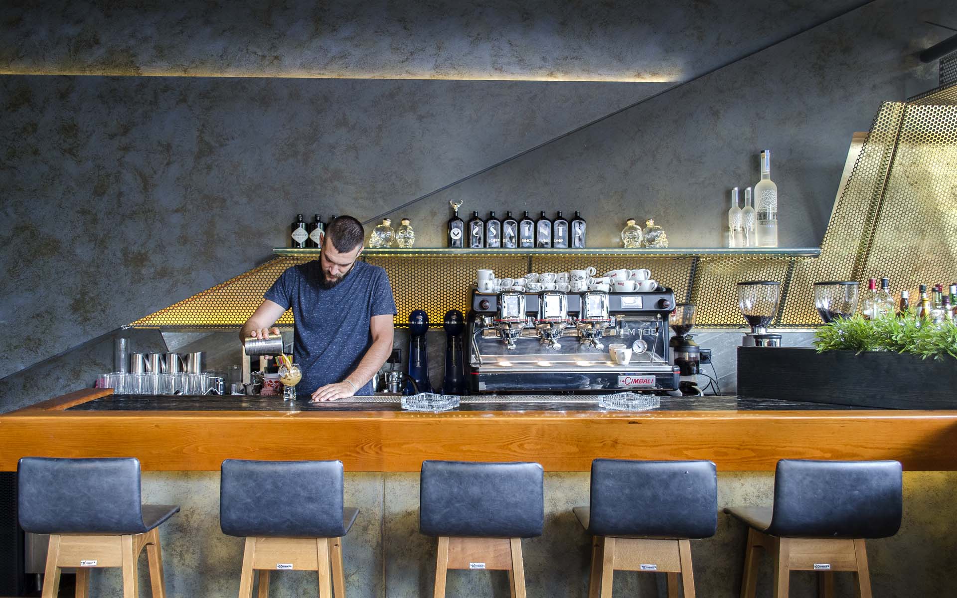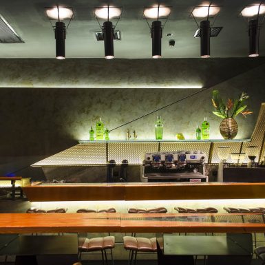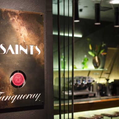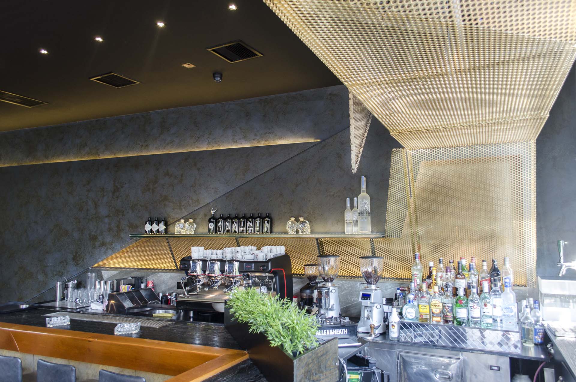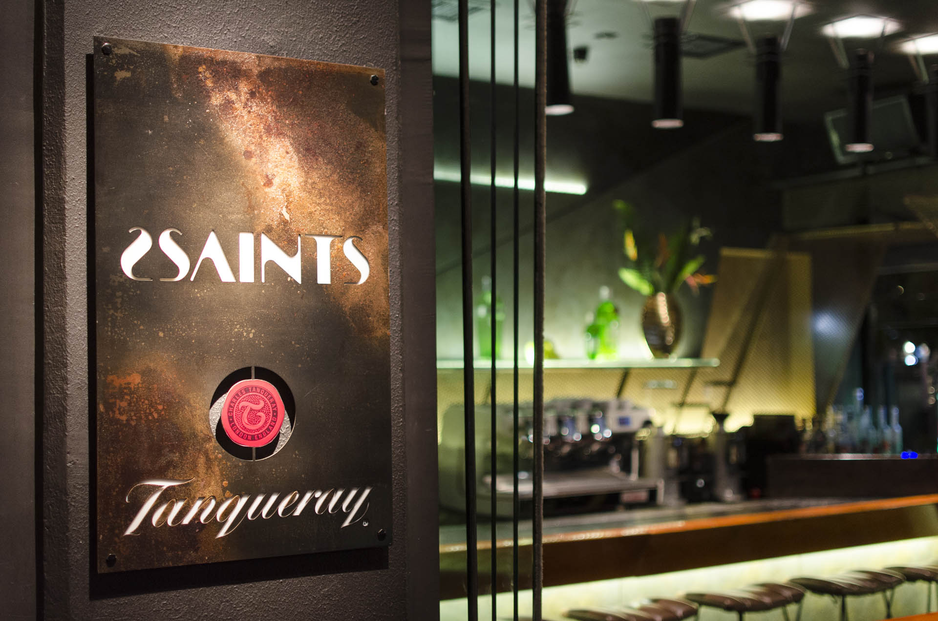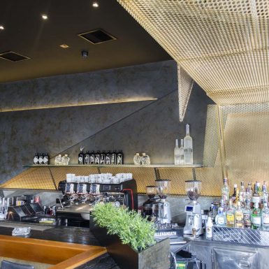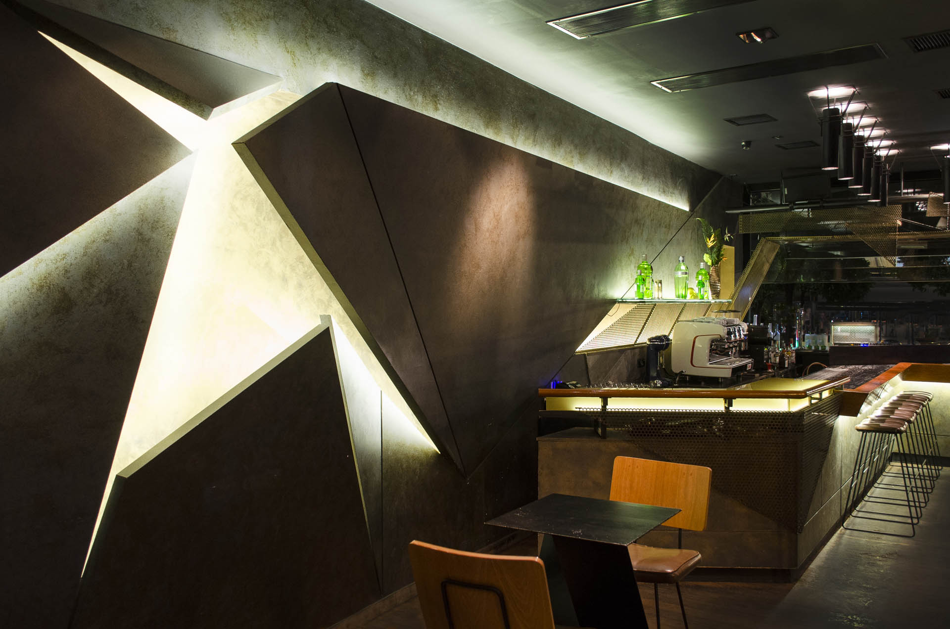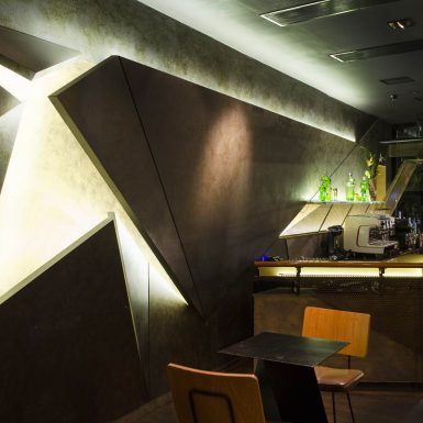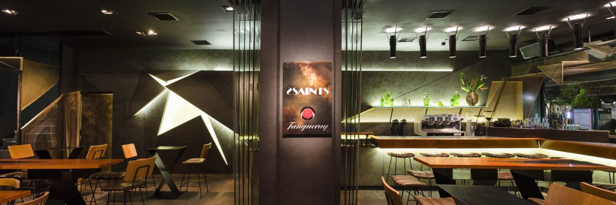 Το bar-cafe ‘2 Saints’ βρίσκεται στο κέντρο της πόλης της Λαμίας. Η ιδιομορφία στον σχεδιασμό του έργου αυτού, έγκειται στην ύπαρξη ενός μόνο επιμήκους τοίχου, ο οποίος αποτελεί το βασικό καμβά της σύνθεσης. H ‘μεγάλη έκρηξη’ στο ένα μέρος του τοίχου δίνει τη σειρά της σε έντονους σχεδιαστικούς άξονες που αναπτύσσονται κατά μήκος του έργου κι εκτονώνονται στην άλλη του άκρη, ως μία μεταλλική διάτρητη κορδέλα που ενοποιεί το σύνολο του έργου.