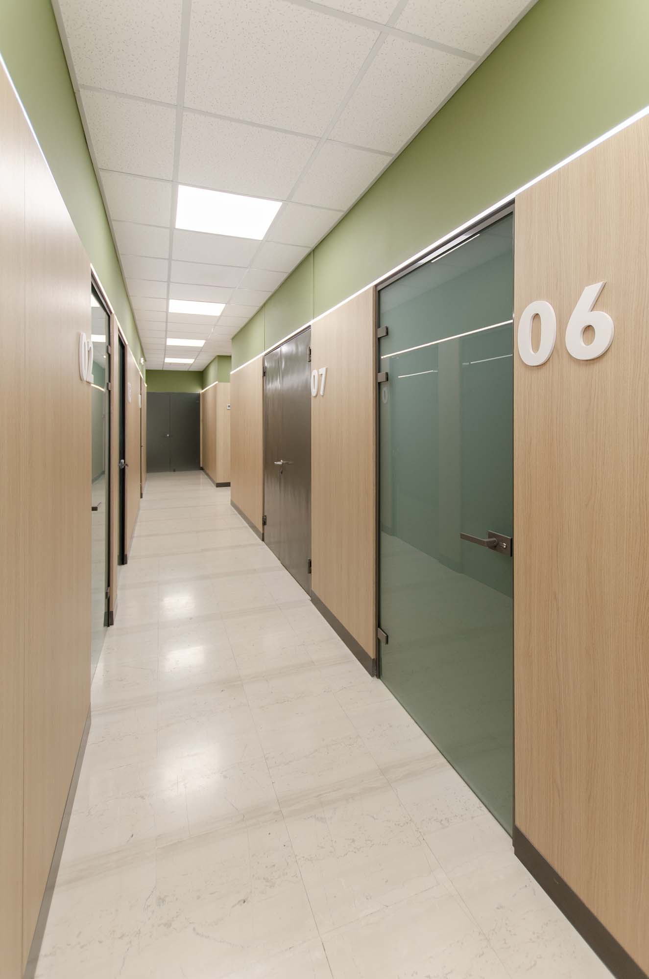 Ο διάδρομος σχεδιάστηκε με έμφαση στη σαφήνεια, την καθαρότητα και την ηρεμία. Οι ξύλινες επενδύσεις σε συνδυασμό με τις ημιδιάφανες γυάλινες επιφάνειες προσφέρουν αίσθηση διακριτικότητας και ιδιωτικότητας, ενώ τα μεγάλα αριθμητικά σήμανσης διευκολύνουν τον προσανατολισμό. Οι πράσινες επιφάνειες στους τοίχους και ο ομοιογενής φωτισμός ενισχύουν μια ατμόσφαιρα ασφάλειας και γαλήνης, συμβάλλοντας στην άνετη εμπειρία του επισκέπτη από την αναμονή έως την εξέταση, δημιουργώντας έναν χώρο που υπηρετεί τόσο τη λειτουργικότητα όσο και την ψυχολογική άνεση.