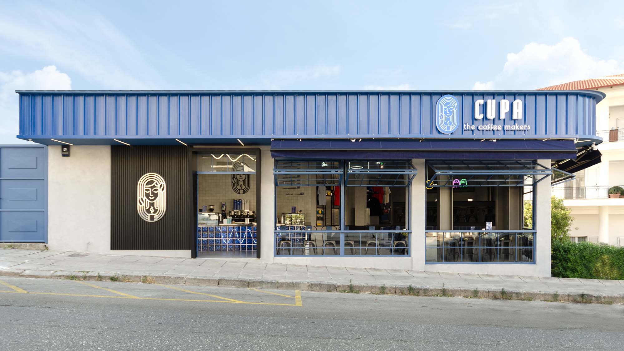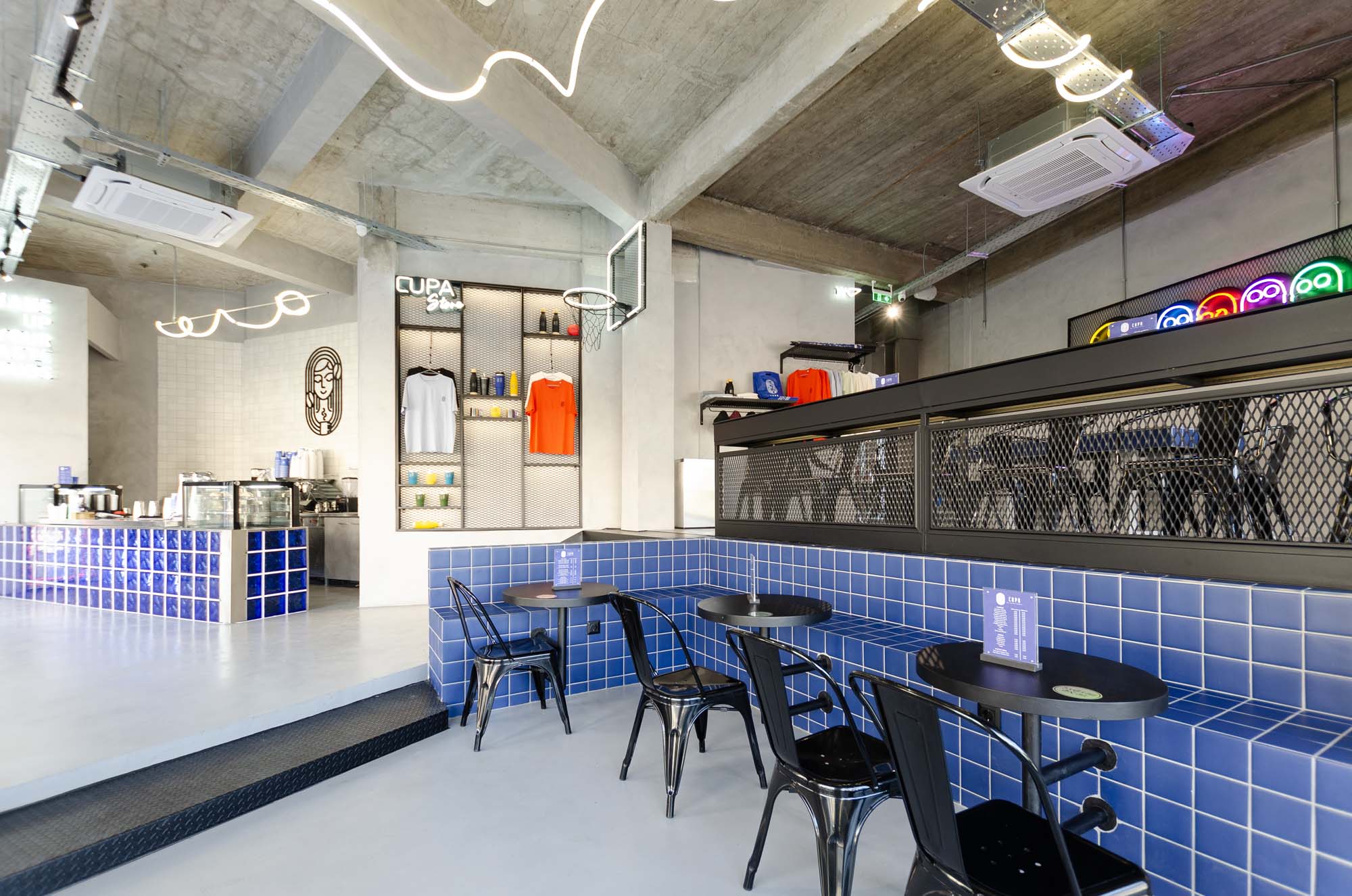 CUPA CAFE was designed with the goal of creating a unique space that combines the functionality of a modern coffee shop with a distinctive, urban character. The architectural approach focuses on using strong contrasts, such as the opposition between smooth, white surfaces and raw, exposed concrete, as well as the combination of cool blue with warm, illuminated details.