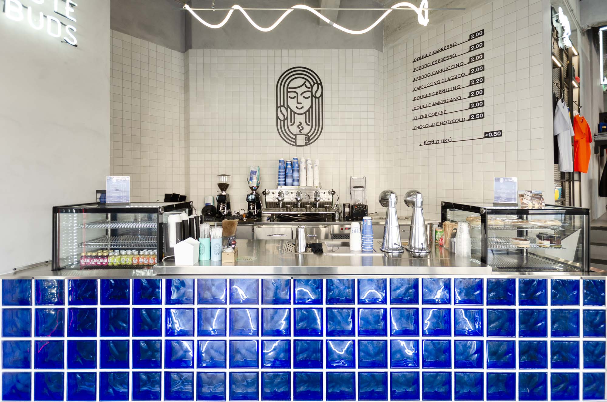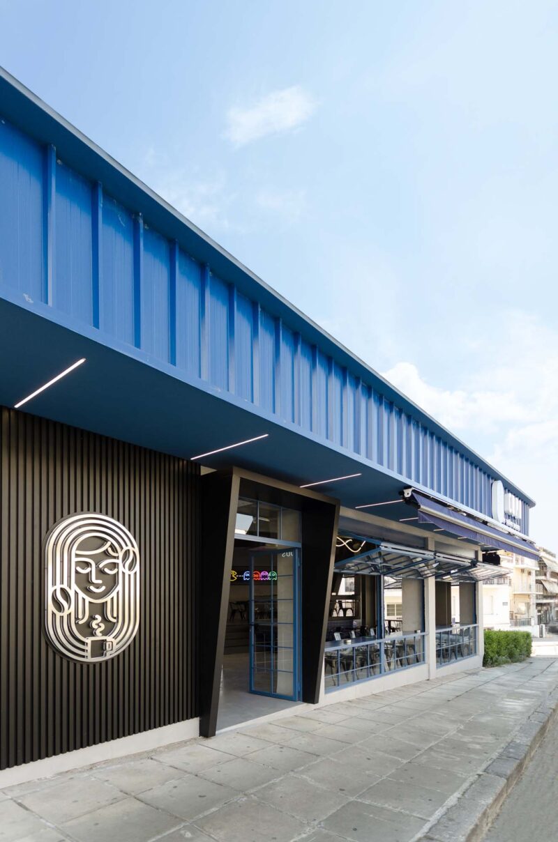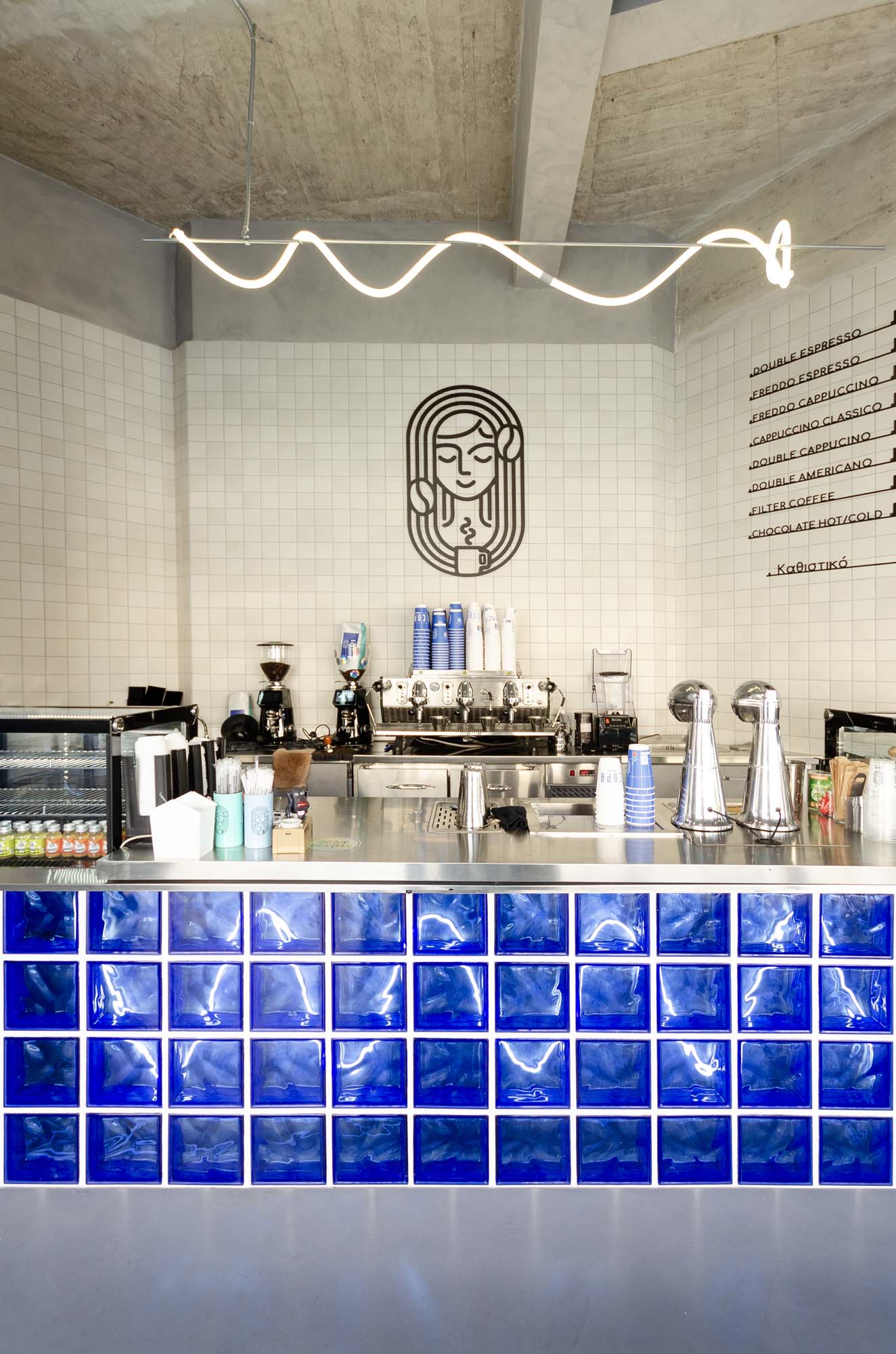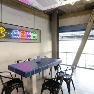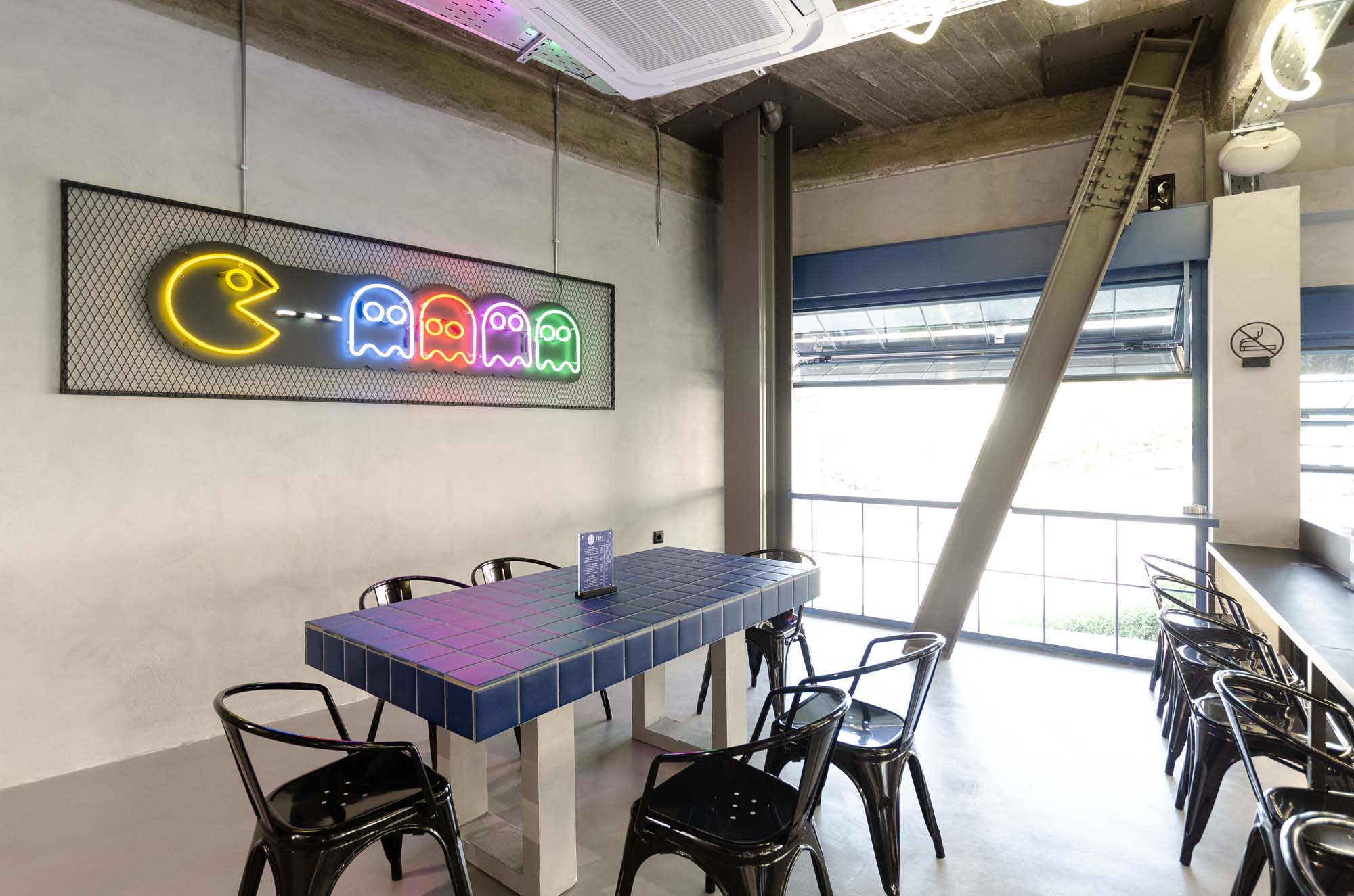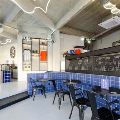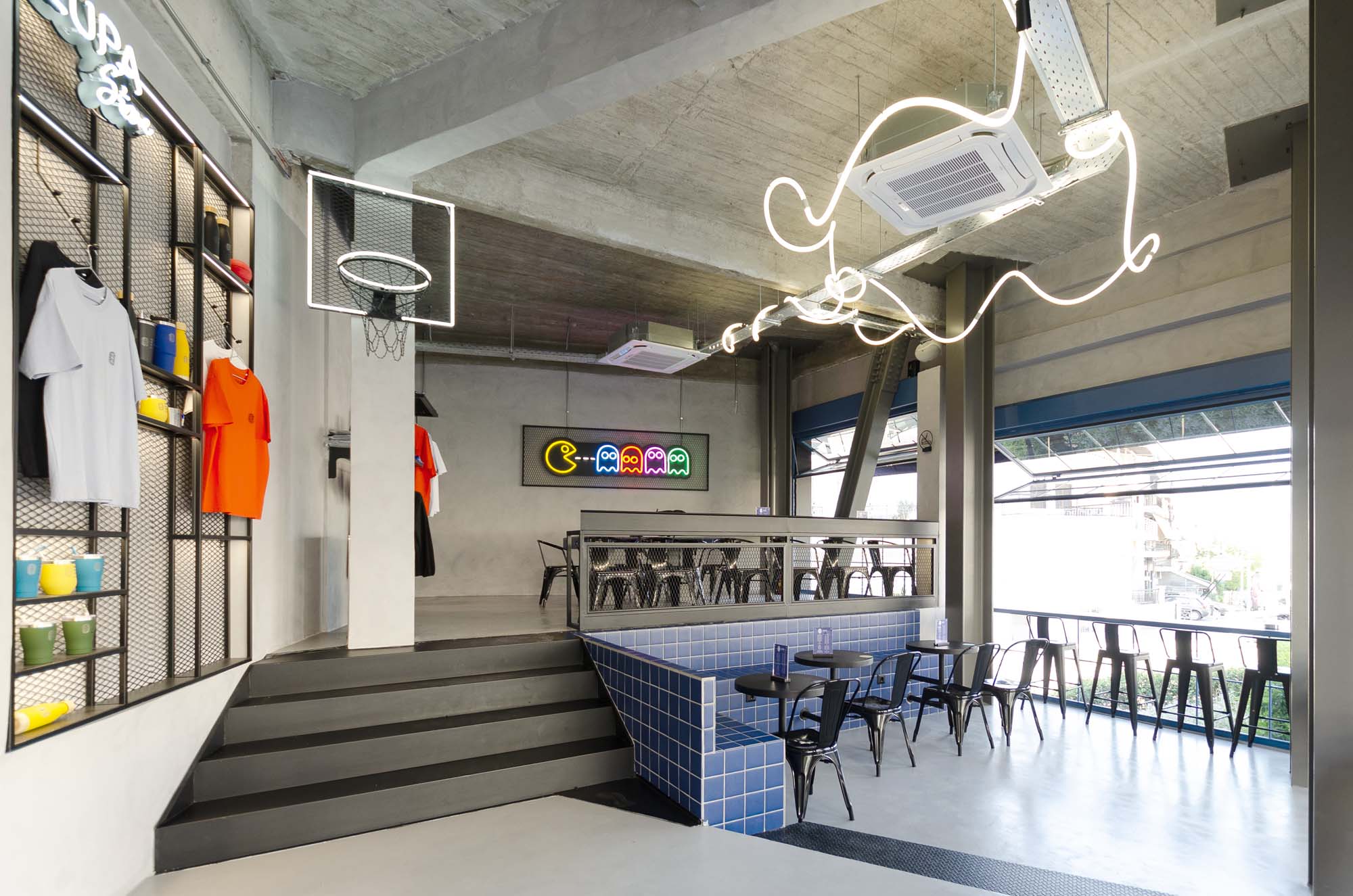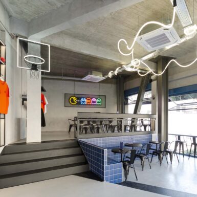 Key elements of the space’s identity are the blue glass blocks and square tiles that cover the front of the counter and the seating area. They add a playful mood while maintaining a modern aesthetic. Hidden lighting and fixtures with organic lines create a dynamic atmosphere, while the presence of a basketball hoop and Pac-Man enhances its pop and urban character.