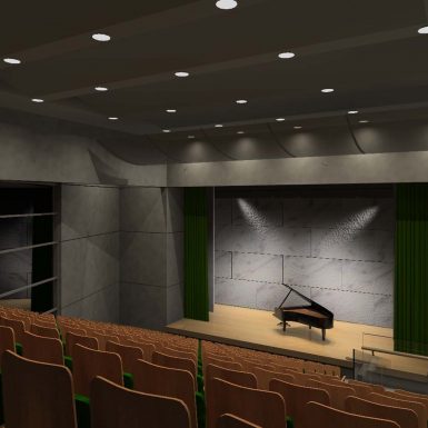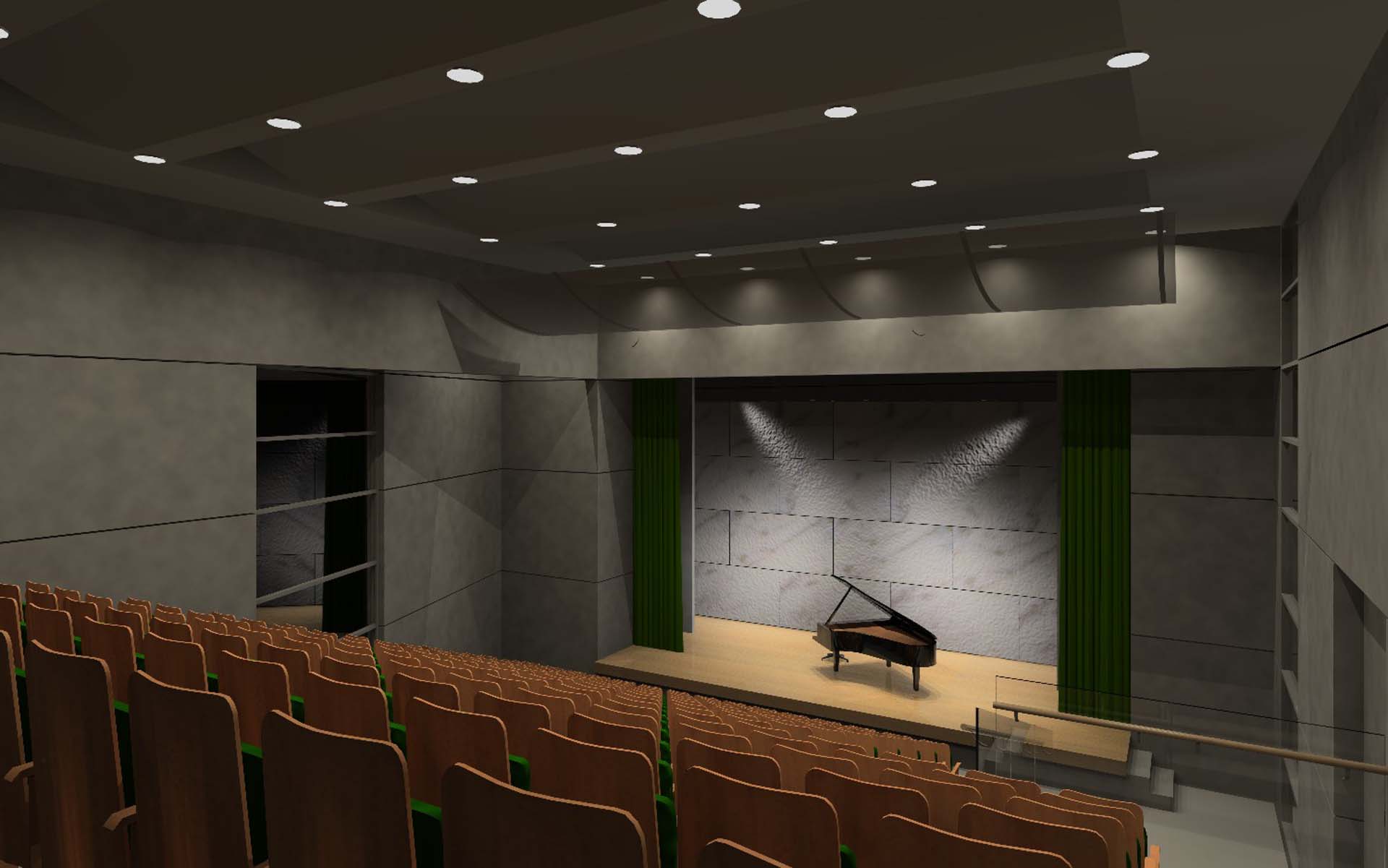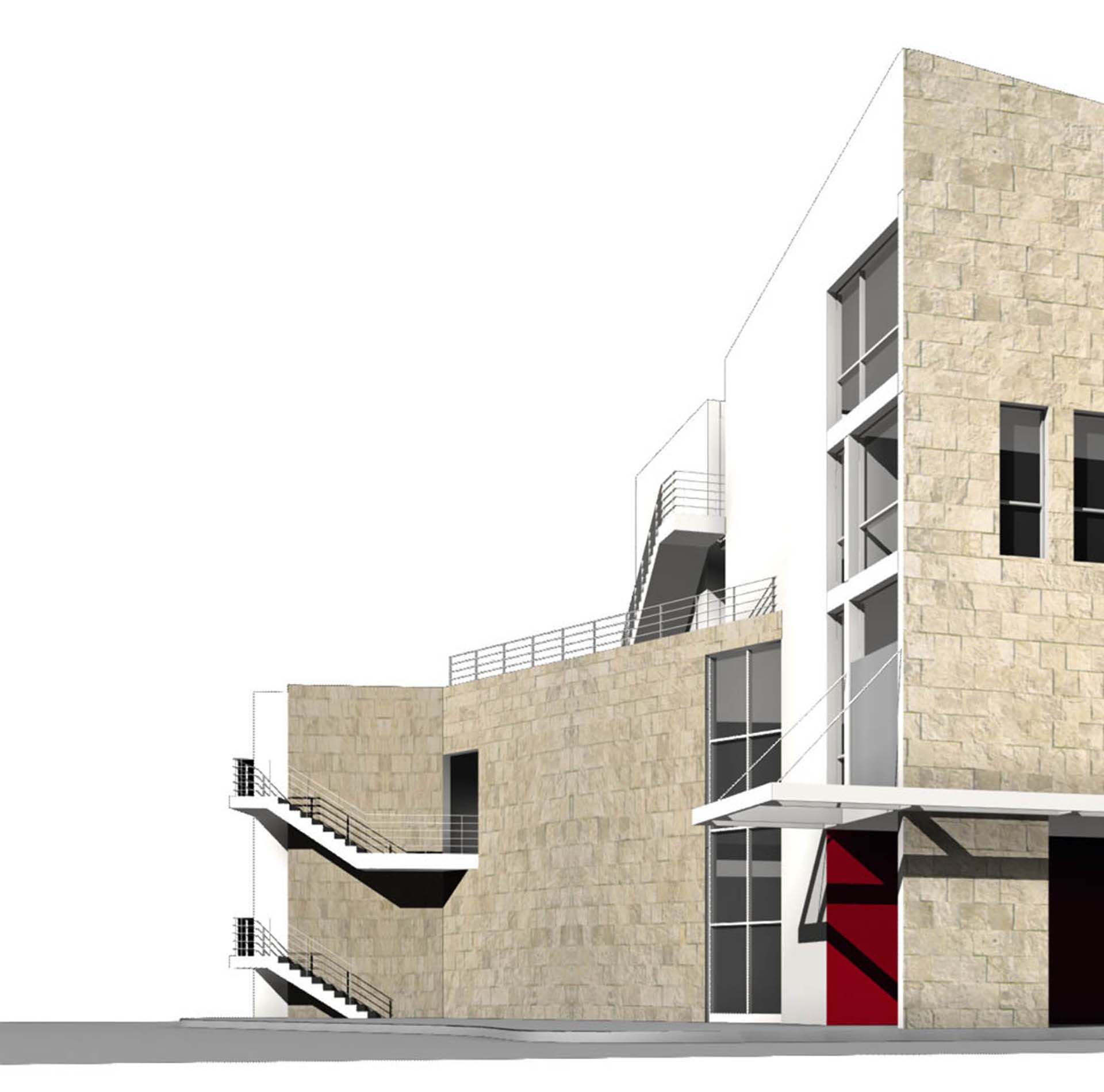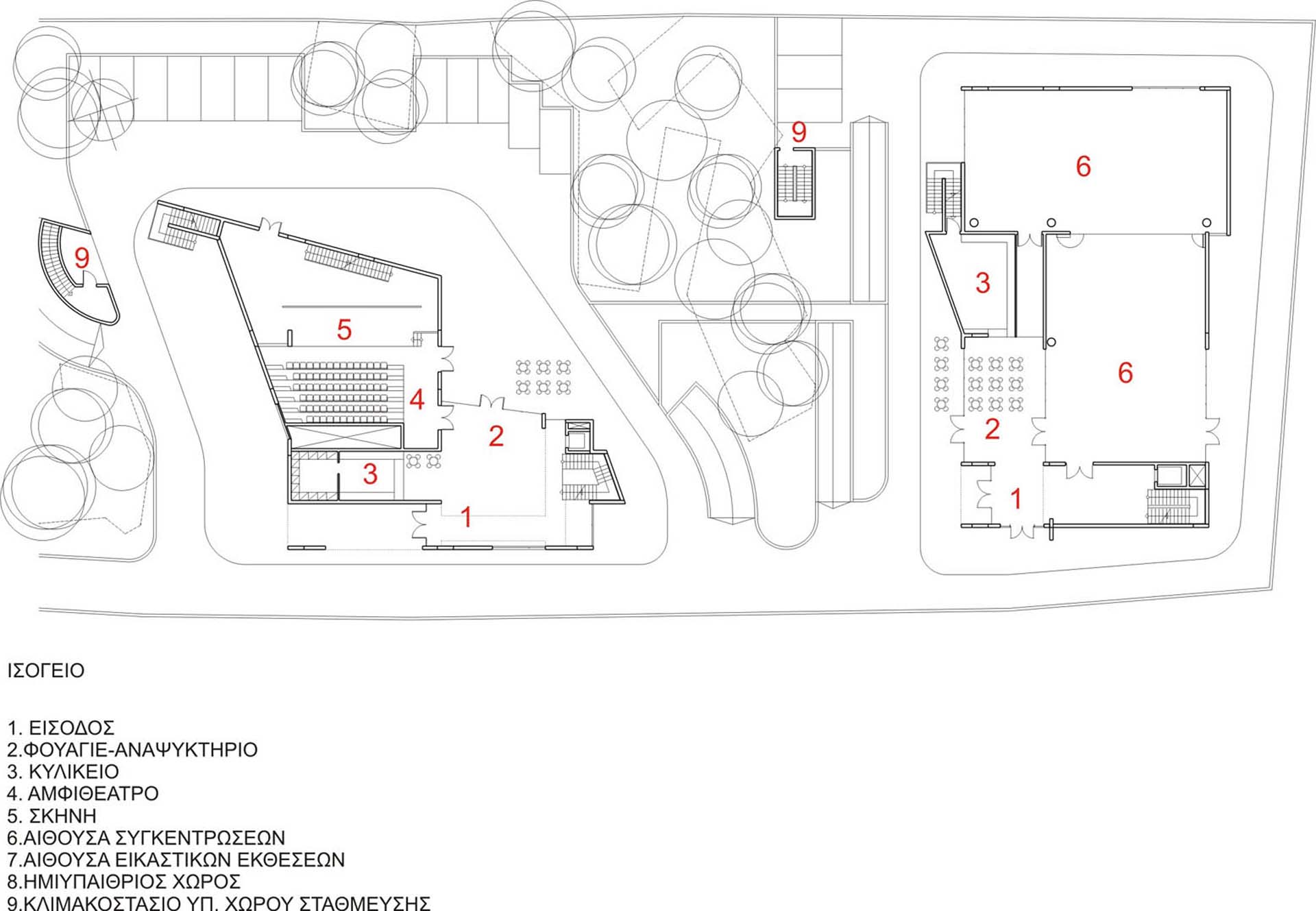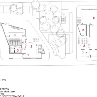 The main axis of the project coincides with the main circulation axis of the plot that runs across the Southern side of the plot. This axis adjoins the main Southern facade of the plot and it penetrates the building from its Western side to its Eastern one. There we can find all the main entrances of the buildings’ complex and the stairwells. Ιn this way we shape the backbone of the project on which are located all the main function spaces. Despite the fact that the project is constituted of two buildings, their continuity has not been disturbed. All of the activities and the public circulation create a strong connection between them and generate a united Cultural Centre. The penetrability of the buildings’ volumes in the east-west axis gives the opportunity to its surrounding landscape to penetrate into the unit.