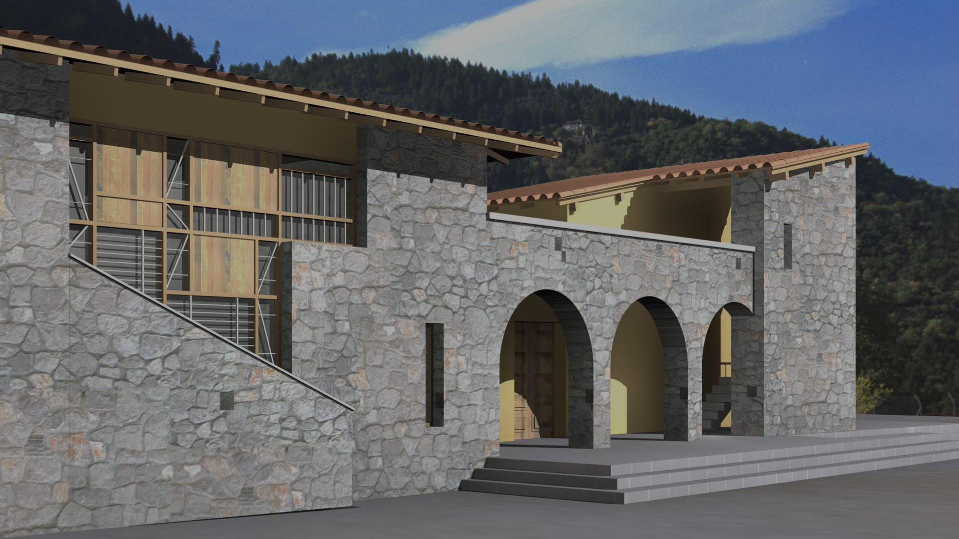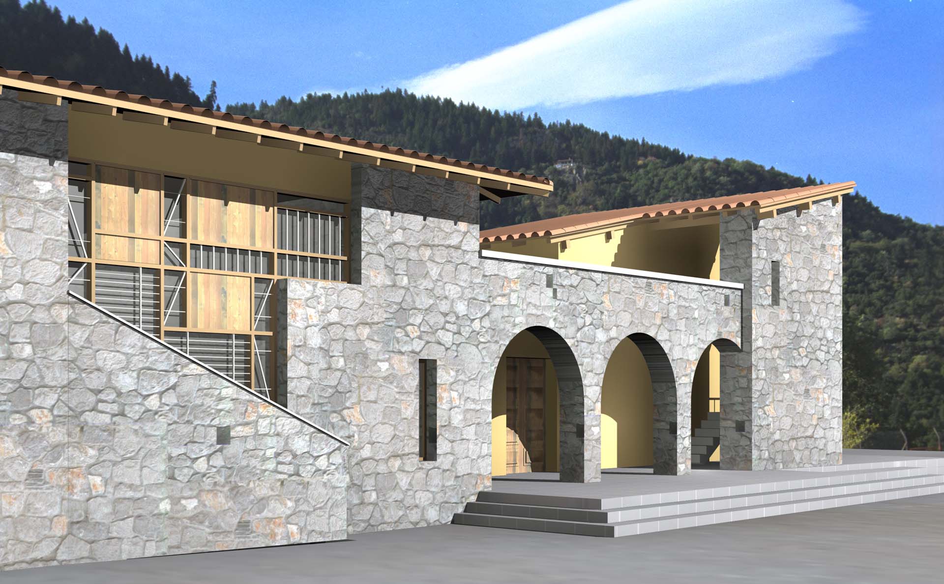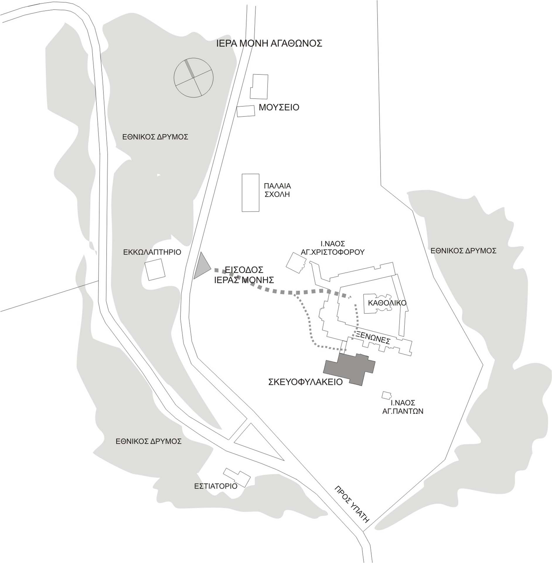 The Holy Place of Agathonos’ Monastery is a crossed temple with a dome that is surrounded by a well-preserved stonework. Several wall paintings that were created in three different time-periods (16th century, 18th and end of 20th century) are being preserved in its interior along with the Monastery’s possessions of pictures, reliquaries, vestments and books from the 15th century. The today’s project involves the creation of a museum and of a guests’ room and are both orientated to the Holy Temple of Virgin Mary, which constitutes the central part of the Monastery. The main access to the building is from the North-Western side that is also the entry to the Monastery. An additional entry is located in the internal courtyard of the Monastery. The exhibition area is divided into two uninterrupted spaces. Through the reception we can also visit the Library of the Museum that is located in the South-East side and it can easily be isolated from the public.